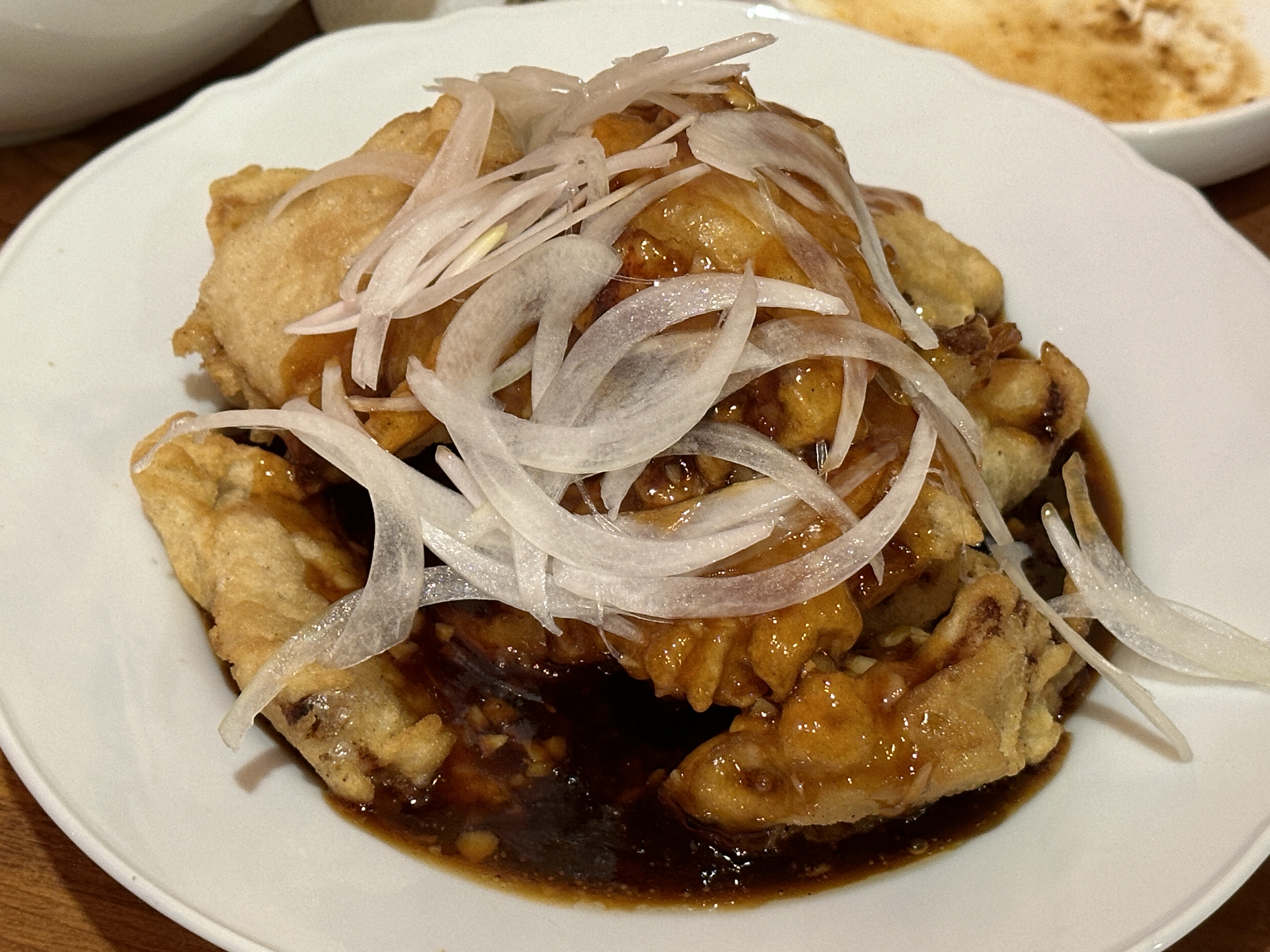 소스는 뿌려서 나오고 위에 양파채가 올라가 있어요.